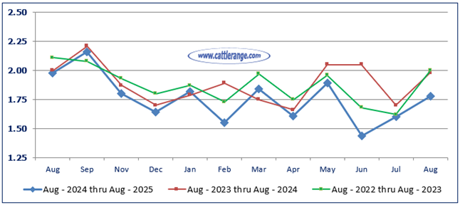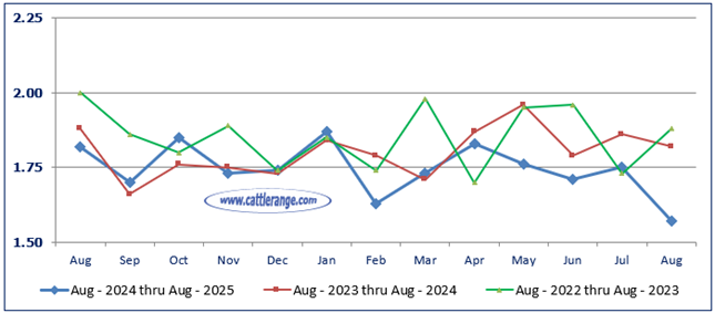 Marketings of fed cattle during August totaled 1.57 million head, 14 percent below 2024. Marketings were the lowest for August since the series began in 1996.