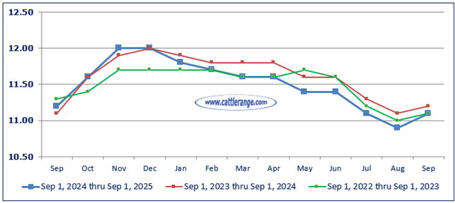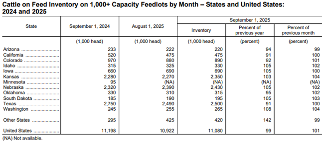 Cattle and calves on feed for the slaughter market in the United States for feedlots with capacity of 1,000 or more head totaled 11.1 million head on September 1, 2025. The inventory was 1 percent below September 1, 2024.