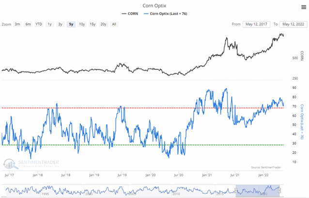 So when Public Opinion moves above the red dotted line in the chart, it means that compared to other readings over the past year, you're seeing excessive optimism. You also want to look at the absolute level of Opinion, too - if it's at 90%, then there's no question we're seeing an historic level of bullish opinion. Watch for readings above 80% (or especially 90%) to spot those dangerous times when the public is overly enthusiastic about a commodity.