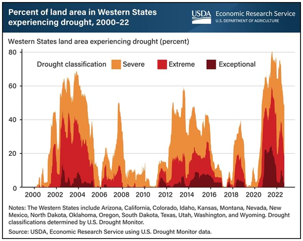 The USDM categorizes drought in a region according to soil moisture, streamflow, and precipitation levels. Regional designations are primarily based on historical weather patterns. For agriculture, drought can mean diminished crop and livestock outputs, as well as reduced farm profitability. Drought also reduces the quantity of snowpack and streamflow available for diversions to irrigated agricultural land. These impacts can reverberate throughout the local, regional, and national economies. Find additional information on the USDA, Economic Research Service’s newsroom page Drought in the Western United States
