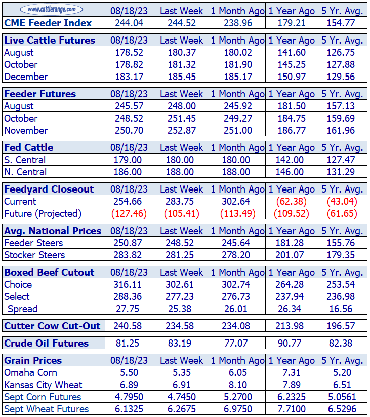 For the week, fed cattle trade in the Southern Plains was 1.00 lower with trade in the North 2.00 lower. Feeder cattle and stocker calves were about 2.50 higher. Live cattle futures and feeder futures were both lower. The dressed beef cutouts surged higher with corn closing higher.