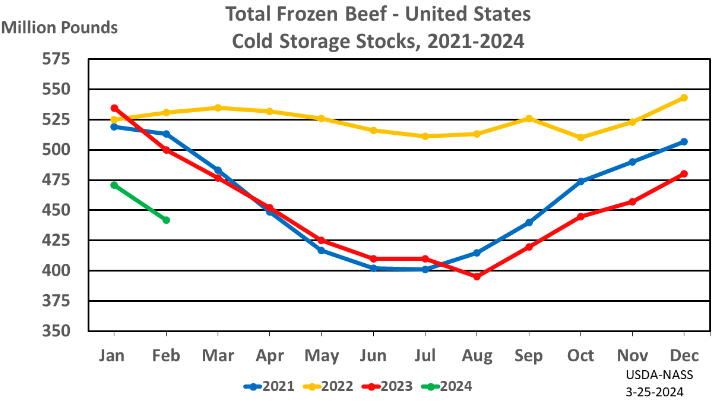 Total red meat supplies in freezers on February 29, 2024 were down 4 percent from the previous month and down 13 percent from last year.