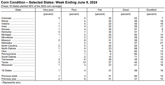74% of Corn Crop rated as Good to Excellent compared to 75% last week and 61% last year.