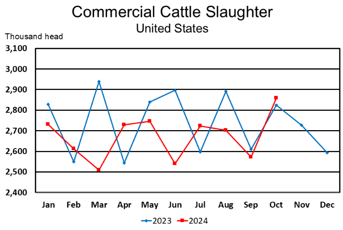 - Beef production, at 2.47 billion pounds, was 5 percent above the previous year. Cattle slaughter totaled 2.86 million head, up 1 percent from October 2023. The average live weight was up 44 pounds from the previous year, at 1,418 pounds.