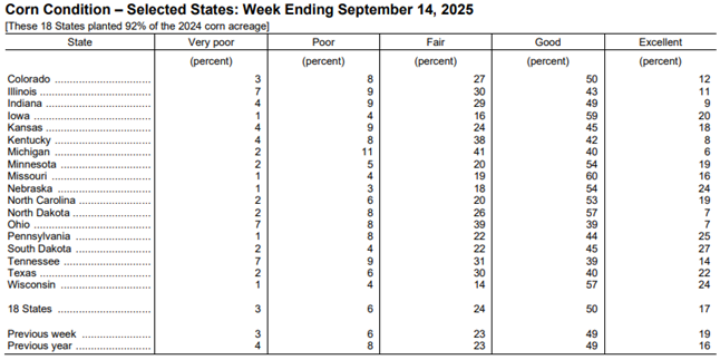 67% of Corn Crop Condition rated as 'Good to Excellent' compared to 68% Last Week and 65% Last Year.