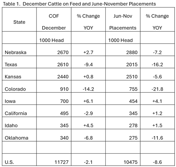 The regional changes are significant. Feedlot inventories in Texas have been smaller than Nebraska the past two months, which has only happened a few times since 1971. Table 1 below shows the current on-feed inventories and feedlot placement totals the past six months for the top eight cattle feeding states. Placements have decreased 16.2 percent year over year in Texas compared to 7.2 percent in Nebraska. December feedlot inventories are down 9.4 percent in Texas but actually up 2.7 percent year over year in Nebraska. Colorado, the number four cattle feeding state, has also dropped sharply with the six-month total of placements down 21.8 percent and the on-feed total for December down 14.2 percent compared to last year.