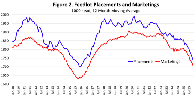 The rather slow decline in feedlot inventories masks a sharper drop in feedlot placements and marketings. Feedlot placements in November were down 11.2 percent year over year and have decreased 8.6 percent in the last six months. Marketings in November were down 11.8 percent from one year ago and have decreased 7.9 percent in the last six months compared to last year. Figure 2 below shows the 12-month moving average annual trends for both placements and marketings. As of November, average of feedlot placements the past year are at the lowest level since April 2016 and average marketings are the lowest since August 2016. Average feedlot placements and marketings have decreased more dramatically in 2025 as tightening feeder supplies were exacerbated by the lack of Mexican cattle imports.