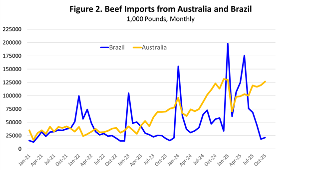Figures 1 and 2 shows the dramatic increase in beef imports from both Australia and Brazil since 2022. Figure 2 also illustrates the dramatic difference in the seasonal pattern of beef imports from the two countries. Beef imports from Brazil are included in the “Other Country” quota. Since 2022, Brazil has moved quickly in January of each year to fill the “Other Country” quota before being subject to over-quota tariffs. The January spikes in imports of Brazilian beef are obvious in Figure 2. In 2025, a second peak in beef imports from Brazil occurred in May as market values stimulated additional imports despite the over-quota tariffs and additional 10 percent tariffs imposed in April. However, an additional 40 percent tariff imposed on Brazil in August did result in sharply lower imports from Brazil in September and October. By the end of November, all the of the additional tariffs have been removed leaving Brazil with only the over-quota tariff (26.5 percent) for the remainder of the year.