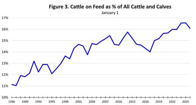 Figure 3 below shows that the cattle feeding industry has grown relative to the overall size of the cattle industry. As 2026 begins, 16.1 percent of all the cattle in the country were in feedlots, down slightly from the peak in 2024 and 2025. The January 1 feedlot inventory was 56.5 percent of the estimated feeder supply of 24.5 million head, implying that there are 1.77 head of feeder cattle available to enter feedlots relative to the current feedlot inventory. With an estimated feedlot turnover rate of 1.99, the current supply of feeder cattle is not sufficient to maintain the current feedlot inventory.