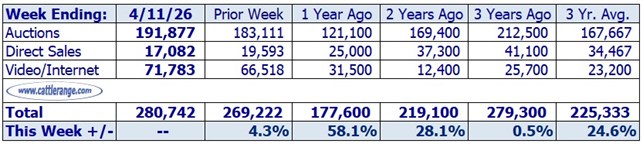 The number of feeder & stocker cattle marketed for the week ending 4/11/26 was 24.6% higher than the 3 Year Average.
