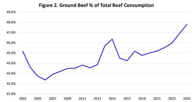 A breakdown of beef consumption shows that per capita supplies of ground beef increased in 2025 to the highest level since 2004. Ground beef supplies were estimated at 28.6 pounds per person, up 0.61 pounds per person. Remaining beef consumption (carcass) was estimated at 31.2 pounds, down 0.44 pounds per person (Figure 1 above).