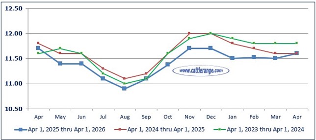 Cattle and calves on feed for the slaughter market in the United States for feedlots with capacity of 1,000 or more head totaled 11.6 million head on April 1, 2026. The inventory was 1 percent below April 1, 2025. The inventory included 7.26 million steers and steer calves, down slightly from the previous year. This group accounted for 63 percent of the total inventory. Heifers and heifer calves accounted for 4.32 million head, down 1 percent from 2025.