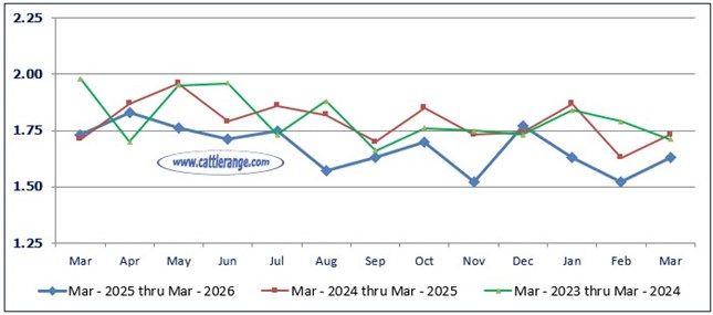 Marketings of fed cattle during March totaled 1.63 million head, 6 percent below 2025. Marketings were the second lowest for March since the series began in 1996.