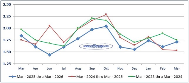 Placements in feedlots during March totaled 1.71 million head, 7 percent below 2025. Net placements were 1.66 million head. Placements were the second lowest for March since the series began in 1996. During March, placements of cattle and calves weighing less than 600 pounds were 320,000 head, 600-699 pounds were 250,000 head, 700-799 pounds were 435,000 head, 800-899 pounds were 474,000 head, 900-999 pounds were 170,000 head, and 1,000 pounds and greater were 60,000 head.