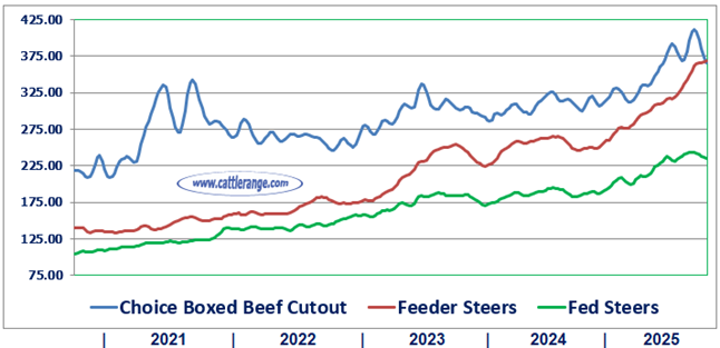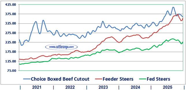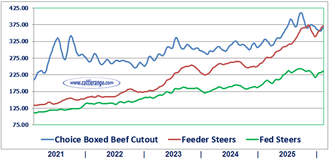 Feeder & Fed Steer Prices vs. Choice Boxed Beef Cutout