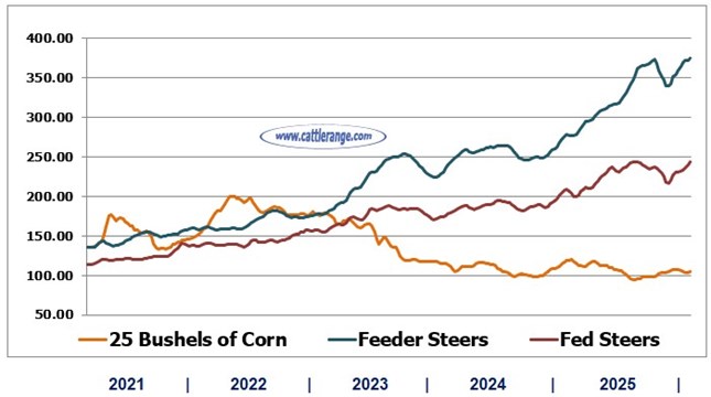 Feeder & Fed Steer Prices vs. 25 Bushels of Corn