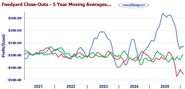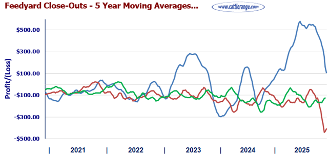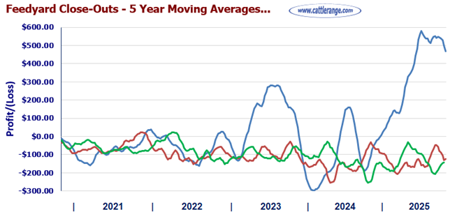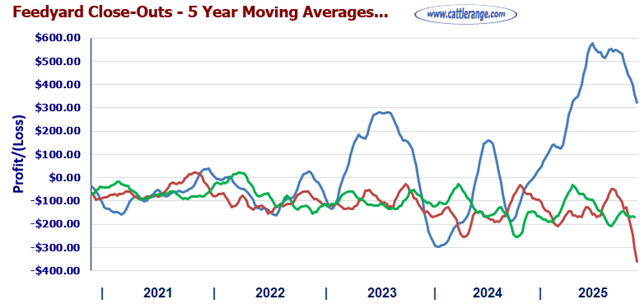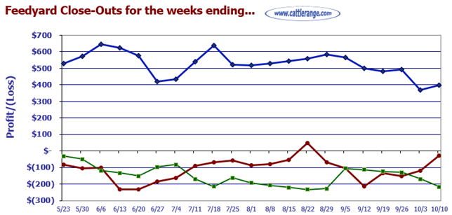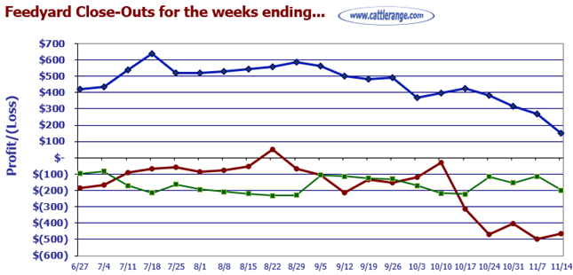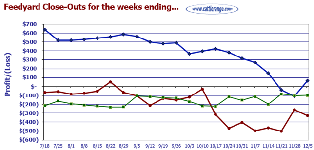 Closeout projections are for cattle placed on feed by a cattle owner at a commercial feedyard and not for cattle owned by a vertically integrated company such as a beef processing company or a feedyard feeding cattle at cost. Cattle cost, cost of gain, and selling price will vary on a regional basis. Cost includes $15 per head for freight to feedyard.