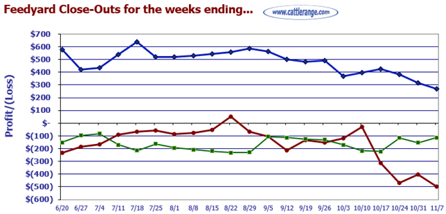 Closeout projections are for cattle placed on feed by a cattle owner at a commercial feedyard and not for cattle owned by a vertically integrated company such as a beef processing company or a feedyard feeding cattle at cost. Cattle cost, cost of gain, and selling price will vary on a regional basis. Cost includes $15 per head for freight to feedyard.