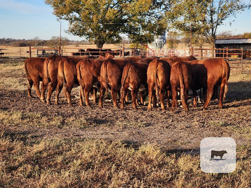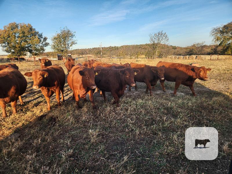 12 HEIFERS, 2 ARE WHITE FACED, LET 10 REDS GO OR ALL 12. CAN LEAVE THE 2 WHITE FACED. CATTLE ARE 7\/8 TO 100 PUREBRED. OUT OF BECKTON AND MUSHRUSH LBW BULLS
